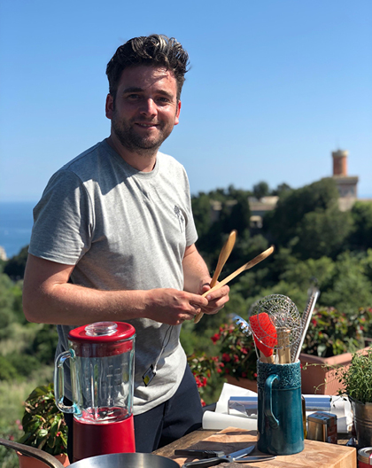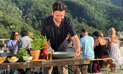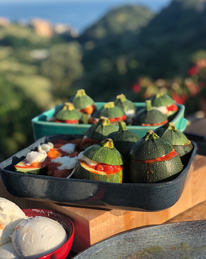 Wim heeft een geweldig gerecht gemaakt met bolcourgettes en pesto gratin. Natuurlijk had Ruggero commentaar op Wims pestorecept. Maar als niet-Italiaan had Wim het er toch aardig afgebracht.