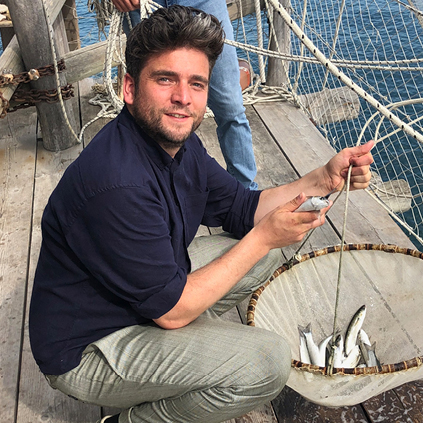 Trabocco op om samen met hem een net uit te gooien. Eerst wilde hij niet want z’n roze shirt was wat niet