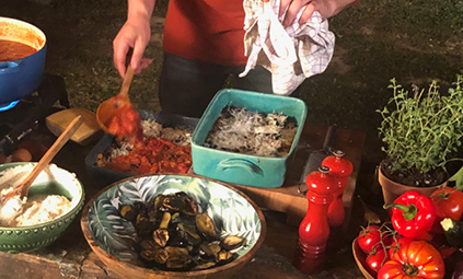 ’s Avonds bij Villa Marsi heeft Wim een geweldige lasagne van aubergine gemaakt met zoete aardappel.