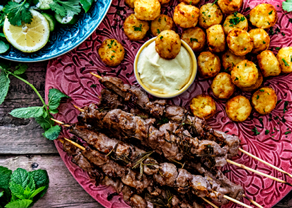 Abruzzo staat bekend om haar Arrosticini, dat zijn spiesjes van lamsvlees. Heerlijk om op de barbecue of op de gril te maken. Wim serveerde er een soort taartjes van rösti mini met een topping van aioli bij. Het leken inderdaad net kleine taartjes. En lekker!