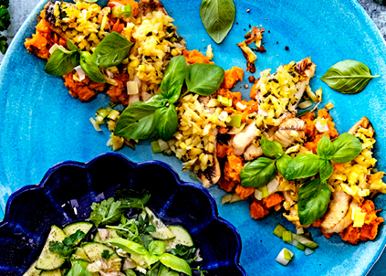 Aubergine of ‘melanzane’ zoals de Italianen het noemen, hier verwerkt in een heerlijke ovenschotel met zoete aardappel, ricotta en Parmezaanse kaas. Genieten!
