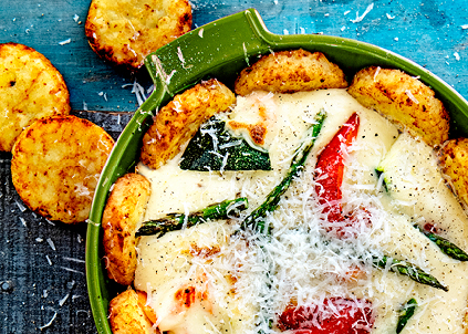 Ben je in de regio Parma dan moet je natuurlijk iets met Parmezaanse kaas doen. Wim heeft er een heerlijke Italiaanse groenteschotel met röstirondjes en een lichte bechamel- saus mee gemaakt (Wims geheim: gebruik een deel bouillon i.p.v. melk). Echt een keer maken!