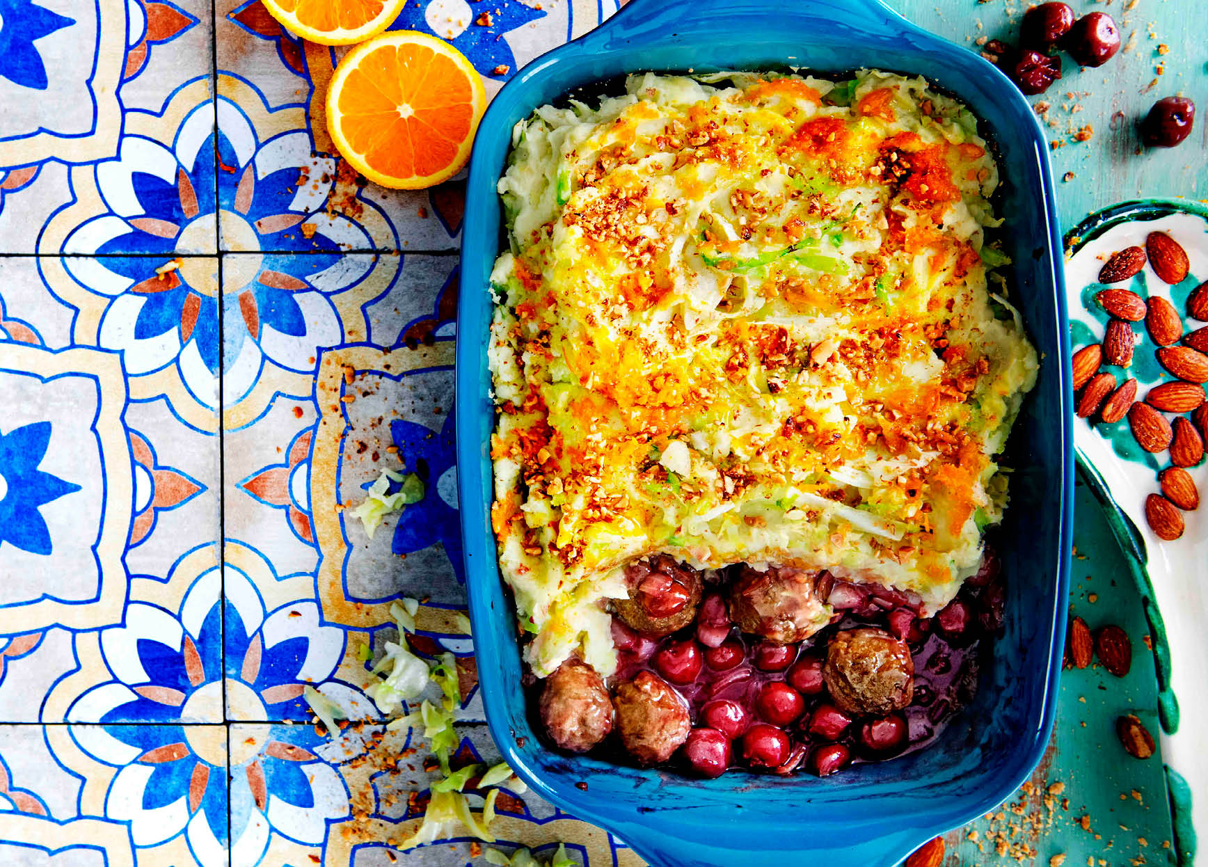 vrienden: Almôndegas-overschotel met kersen, spitskoolpuree en amandel.