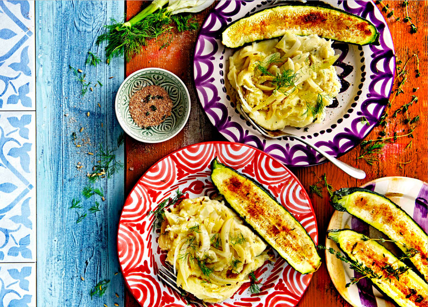 Bij de zoutpannen in Rio Maior maakt Wim voor de familie van Luis en João een heerlijk gerecht met het zout van Loja do Sal; geroosterde courgette met kruidenzoutrub en venkelpuree. Zo jammer dat we weer door moesten want wat was dit gezellig!