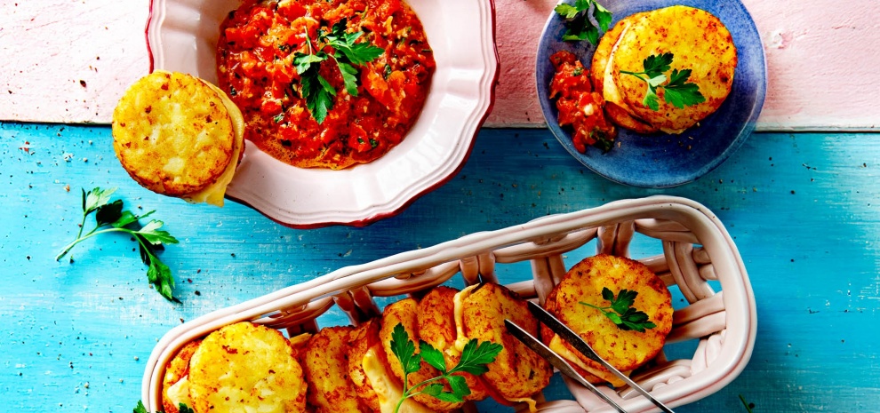 • Serveer de bikini-rösti met de sriracha-salsa.