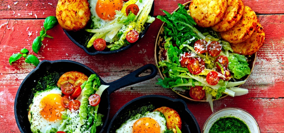 - De basilicum, knoflook en Parmezaanse kaas in de pesto geven de eieren extra smaak, en de olie in de pesto zorgt ervoor dat ze niet aanbakken. Onweerstaanbaar op krokante röstirondjes!