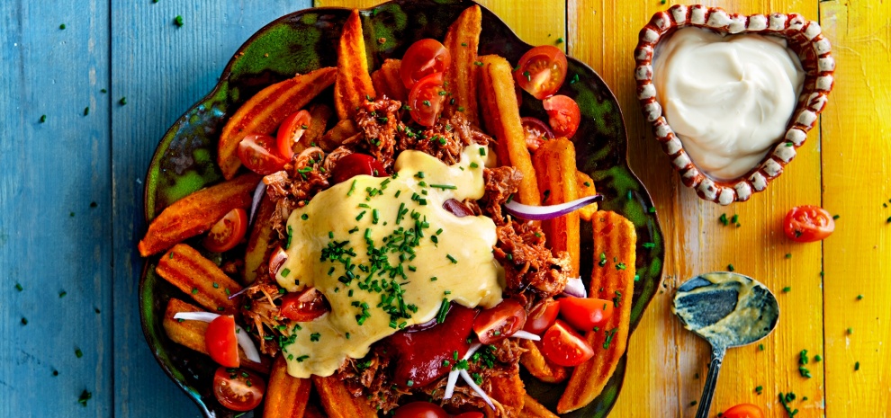 • Schep de Wavy friet op een schaal of 4 borden. Verdeel er de pulled chicken, de tomaatjes en de rode ui over. Schep de rest van de barbecuesaus erover. Schenk de kaasroom over de loaded fries. Bestrooi met de bieslook en serveer met de mayonaise.