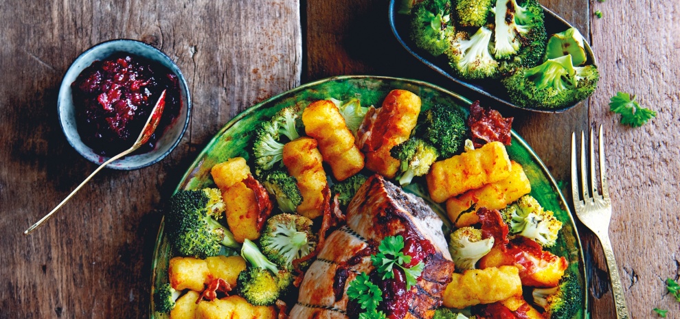 • Leg de champignonrollade op een schaal. Schep er wat cranberrycompote op en garneer met het laatste takje peterselie. Verdeel de broccoli en de aardappelkroketjes met de pancetta rond de rollade. Serveer met de rest van de cranberrycompote.