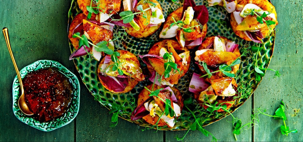 - Leg de röstirondjes op een schaal. Schep wat mangochutney op elk röstirondje. Verdeel er de radicchio over. Snijd de kipfilet in plakjes en leg met een plakje mango op de radicchio. Besprenkel met de bieslookolie en garneer met de cress of extra fijngehakte bieslook.