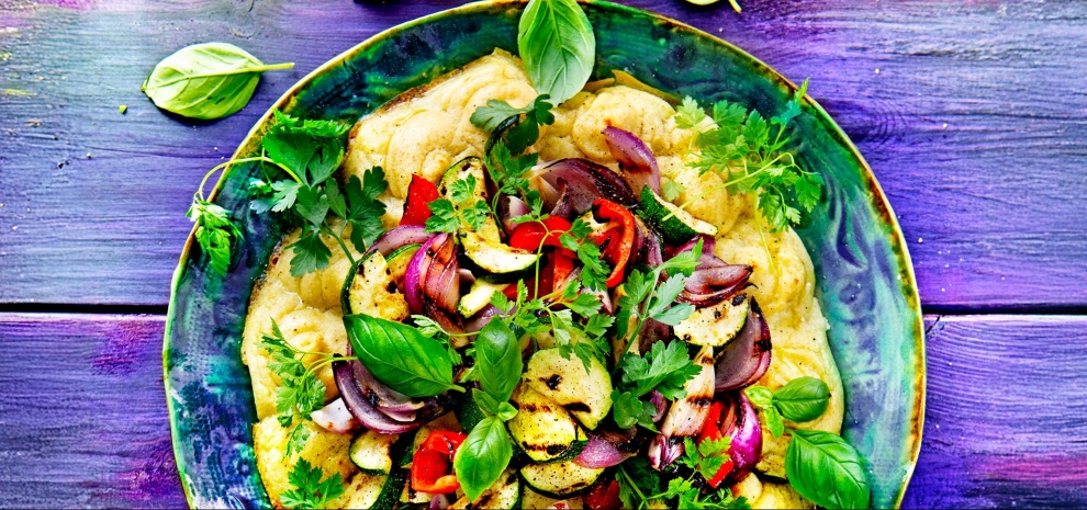 • Deze aardappelpuree-pavlova is knapperig van buiten en romig vanbinnen. Met pesto, gegrilde groenten en kruiden een feestje op de tafel!