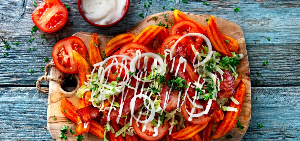 - Schep de Wavy friet op 4 borden of planken. Verdeel er de sla, het spek, de tomaten en de uienringen over. Spuit of schep er de knoflooksaus over en bestrooi met de peterselie.