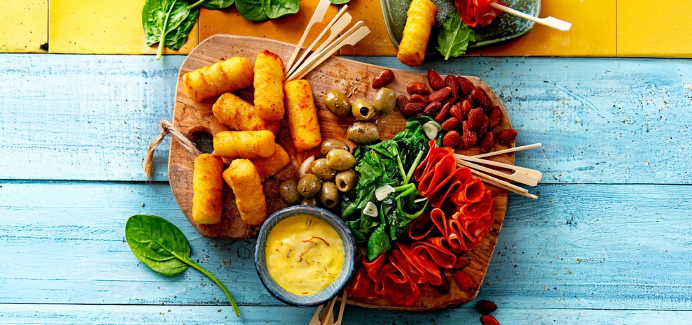 • Schep de knoflookspinazie op een plank of mooie schaal. Leg er de chorizo, de olijven en de amandelen bij. Leg als laatste de knapperige aardappelkroketjes op de plank en serveer met de saffraanmayonaise.