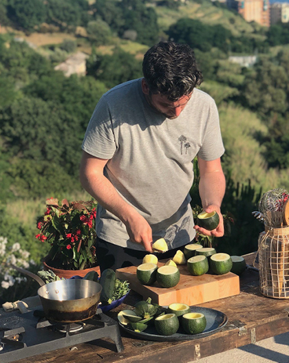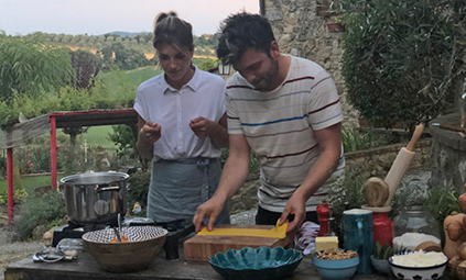 Wim heeft een geweldig gerecht gemaakt met bolcourgettes en pesto gratin. Natuurlijk had Ruggero commentaar op Wims pestorecept. Maar als niet-Italiaan had Wim het er toch aardig afgebracht.