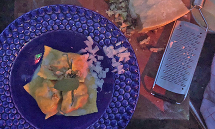 Wim heeft met de pastavellen, gemaakt bij Reka, een heerlijke ravioli gemaakt met een vulling van amaretti