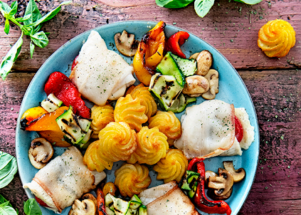 In Carrara heeft Wim een heerlijke saltimbocca gemaakt van vis, lardo (spek), gegrilde groenten en Pom’ Duchesse. Wim over dit recept: “het gerecht om te maken voor een geslaagde avond met uw lief.”