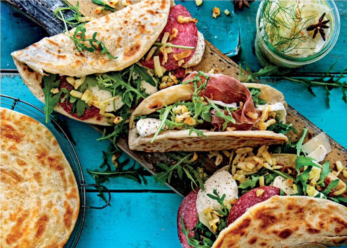 Crescia is een typisch panino/pannenkoek achtig warm broodje. Eigenlijk laat het zich niet goed omschrijven en moet je het gewoon een keer maken. In dit recept heeft Wim de crescia gevuld met salami, parmaham, mozzarella en rösti.