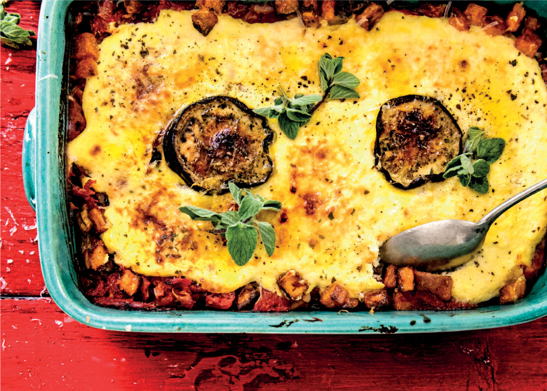Aubergine of ‘melanzane’ zoals de Italianen het noemen, hier verwerkt in een heerlijke ovenschotel met zoete aardappel, ricotta en Parmezaanse kaas. Genieten!