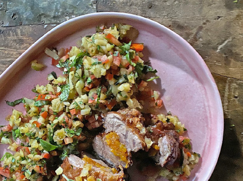 Geroosterde paprika’s met ham aardappelblokjes en romescosaus
