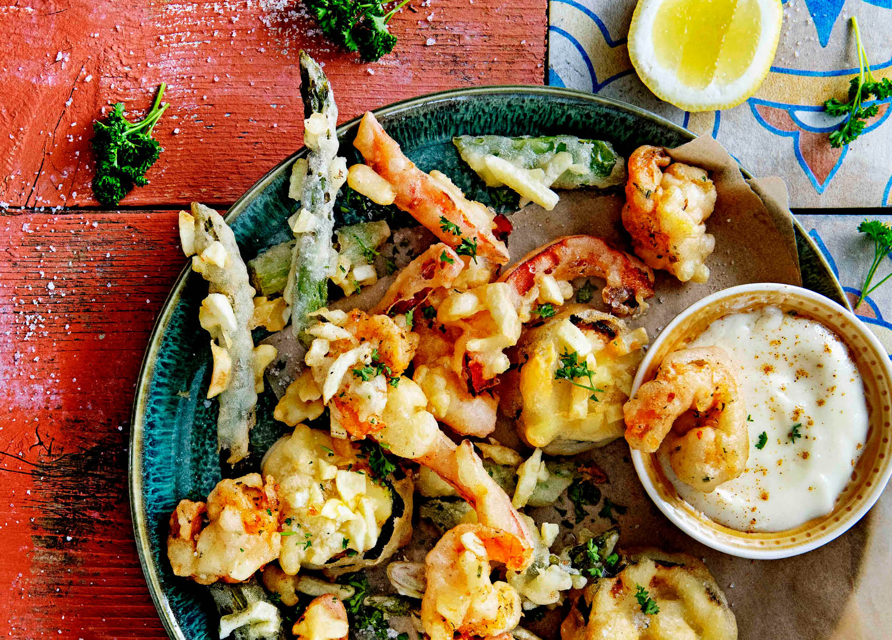 Aan de rivier Minho in Monção laat Wim zijn gasten genieten van zijn huisgemaakte tempura van garnalen en groenten met een heerlijke knoflookdressing. Ze vinden de tempura heerlijk! Wims geheim? Hij gebruikt rösti in het beslag en dat maakt het zo heerlijk knapperig.