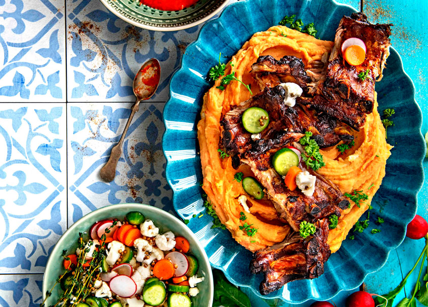 ook groene wijnazijn. De familie van Sara geniet van Wims spareribs met pickled