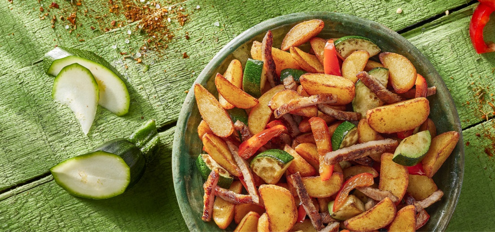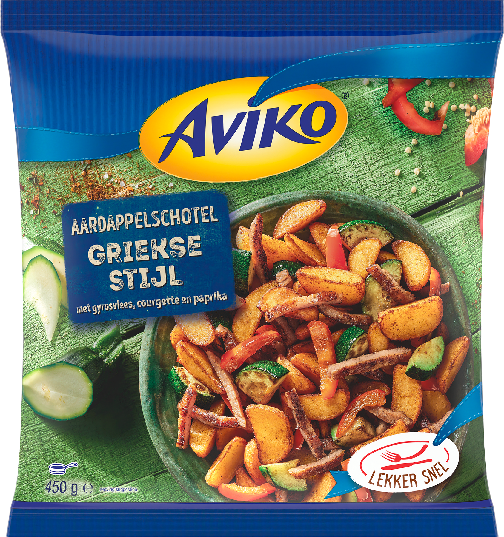 Aviko Aardappelschotel Griekse Stijl is een combinatie van aardappelpartjes, gyros varkensvlees, courgette en paprika. Het is de perfecte, smaakvolle basis voor je maaltijd door de unieke combinatie van aardappeltjes, groenten, kruiden en vlees. Gemakkelijk en snel te bereiden.