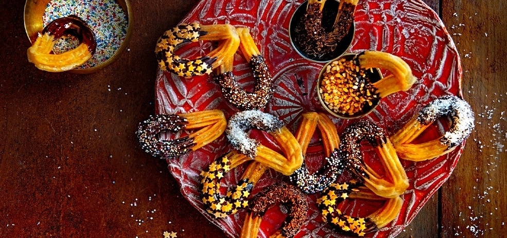 Verras jouw gasten met onze heerlijke Churros; van knapperige churros gedoopt in kaneelsuiker tot een prachtig dessert, een churros-krans met peer, ijs en chocoladesaus. Hieronder vind je een aantal recepten met Churros.