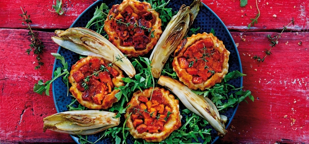 Mini-tarte tatin met zoete aardappel en gekarameliseerde witlof