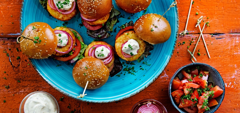 - Dek de burgertjes af met de bovenste helften van de broodjes en steek er eventueel een prikker door.