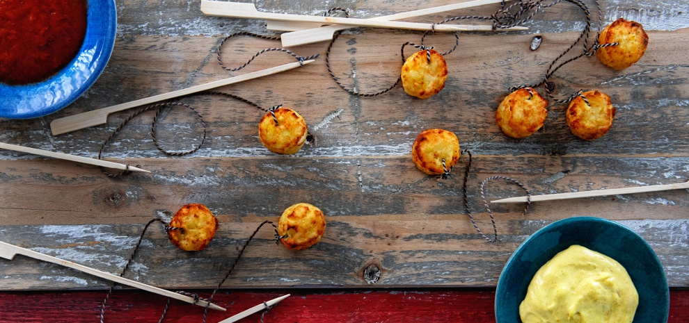 - Knoop het uiteinde van de touwtjes met rösti mini aan de tapasprikkers of stokjes en serveer de hengels met de kerriesaus en ketchup om te dippen.