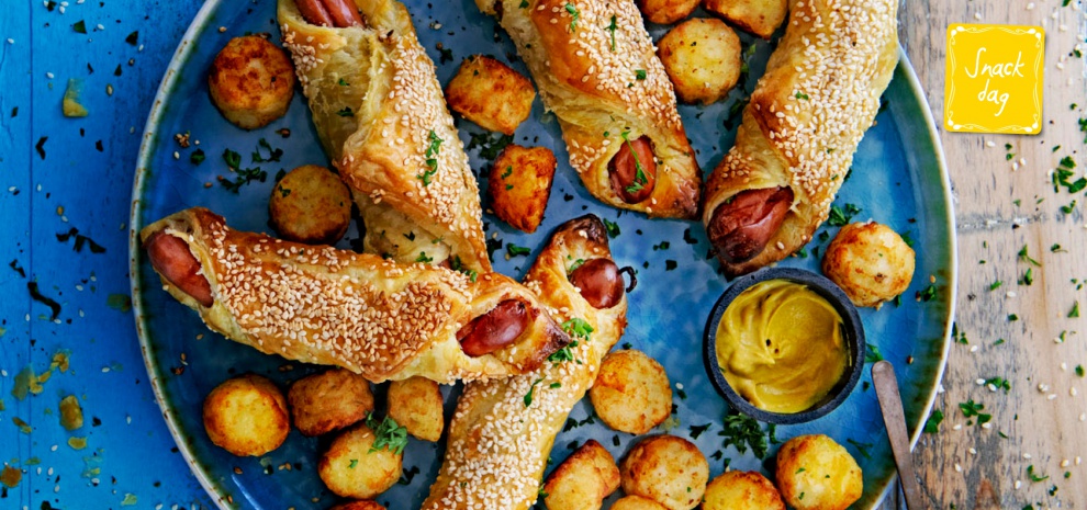 • Verwarm de oven voor tot 200 °C. Wikkel de knakworsten in het deeg en leg ze op de bakplaat.