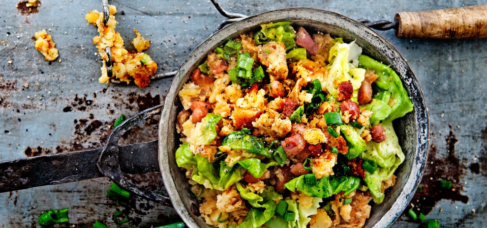 Geroosterde groenten met grillworstjes en Pom’ Duchesse