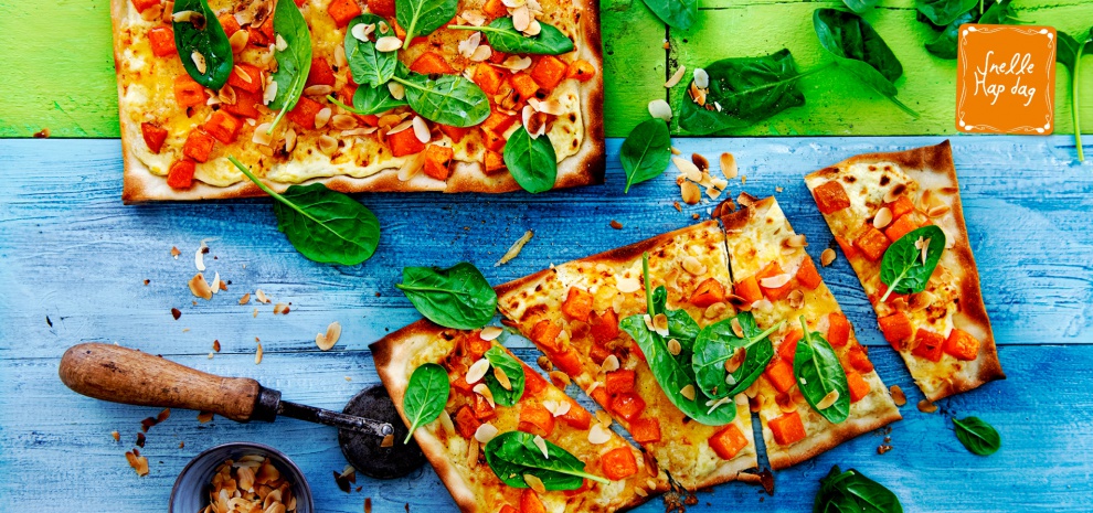 Met zoete aardappelblokjes, spinazie en amandel is dit je nieuwe flammkuchen-favoriet!