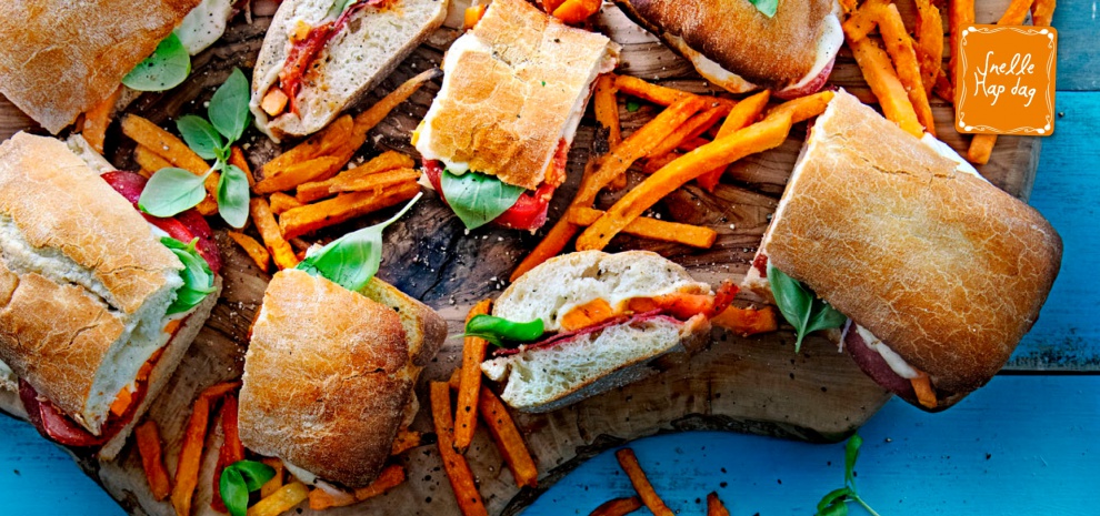 - Snijd de ciabatta’s horizontaal doormidden. Beleg de onderste helften met de salami, tomaat, rest van de zoete aardappel friet, mozzarella en basilicum. Bestrooi met zout en peper naar smaak.