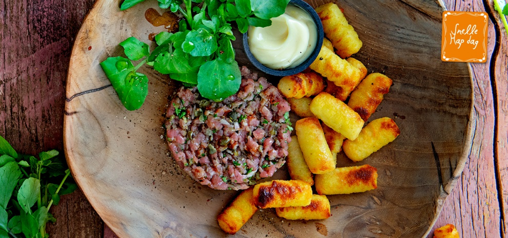 - Schep - gebruik eventueel een kookring - de steak tartare in het midden van 4 borden. Leg er een toef waterkers bij. Schep de kroketjes ernaast en serveer met de mayonaise.