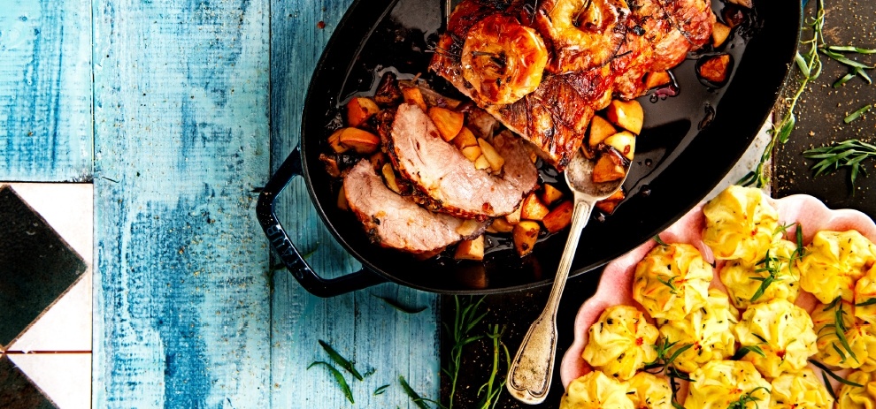 - Schenk de vlierbloesemsiroop bij de appelblokjes en bak nog 3 minuten. Verdeel het appelmengsel over het vlees. Rol het vlees op tot een rollade en bind vast met keukentouw. Steek de rest van de takjes tijm onder het touw.