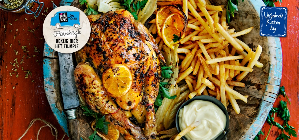 • Leg de kip met de venkel en sinaasappel op een schaal. Schenk de saus erover. Schep de friet erbij en bestrooi met peterselie. Serveer met de mayonaise.
