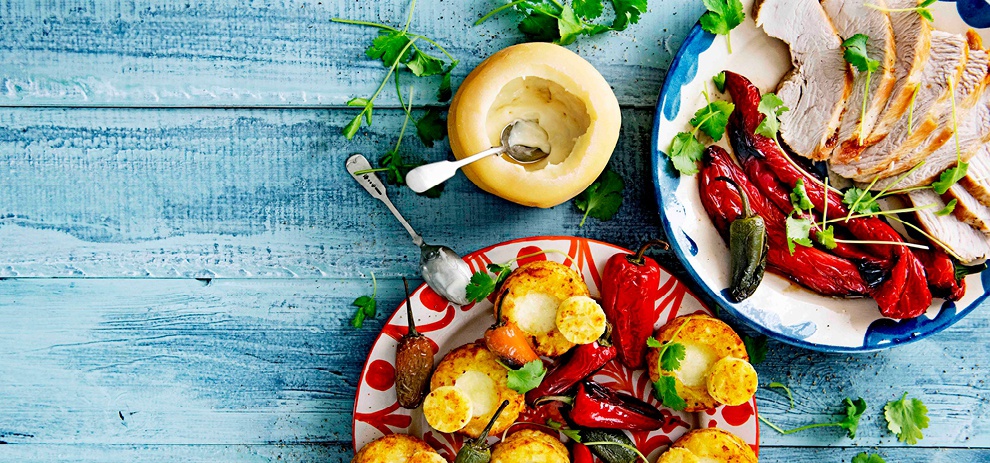 • Leg de jalapeñopepers en de puntpaprika’s bij de gevulde röstirondjes op de bakplaat. Bak de röstirondjes met de paprika’s en de jalapeñopepers in de voorverwarmde oven in 15-20 minuten goudbruin en gaar.