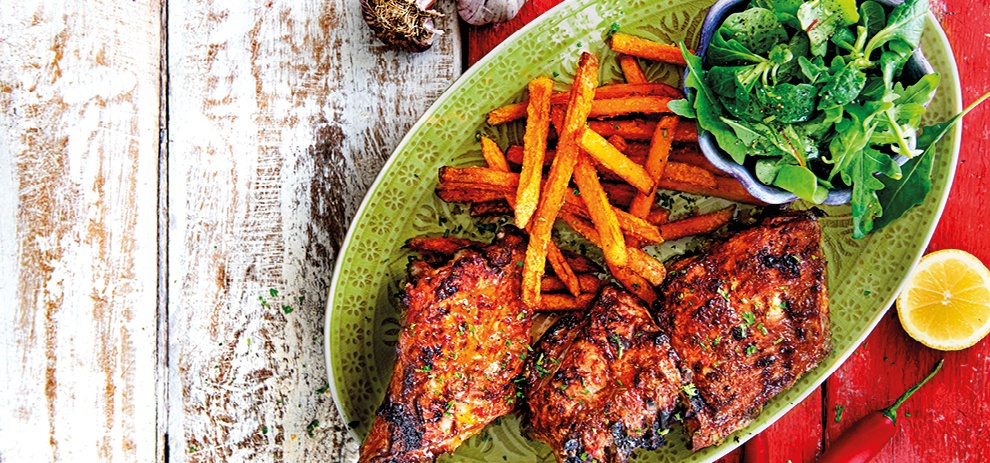• Snijd de spareribs in stukken van 3-4 ribben. Doe de knoflook met de rode peper, de olijfolie en het citroensap in een hoge maatbeker en pureer met de staafmixer glad.