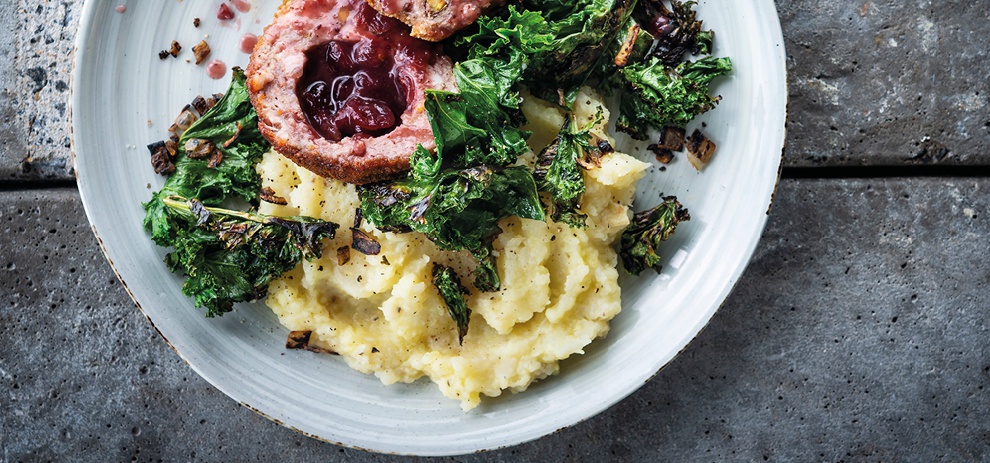 Kerstbal met cranberryvulling, boerenkool en knolselderijpuree