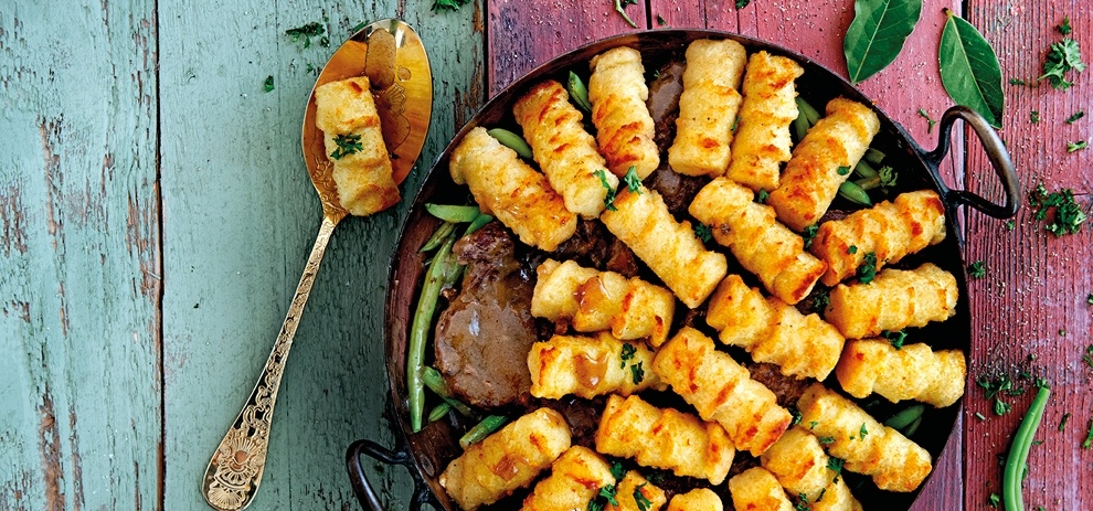 - Oma’s stoof met sperziebonen onder een feestelijke deksel van aardappelkroketjes.