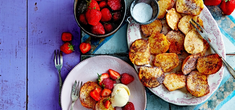 - Serveer de warme pain perdu met het vanilleroomijs en de aardbeien. Bestrooi met poedersuiker.