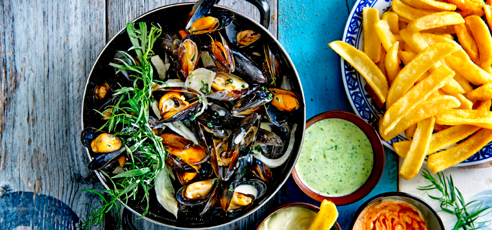 Geen bezoek aan Zeeland zonder een geurige pan Zeeuwse mosselen! Deze zijn bereid met venkel en romige dragonsaus, en serveer je met dips waarin je niet alleen de mosselen dipt maar ook de friet!