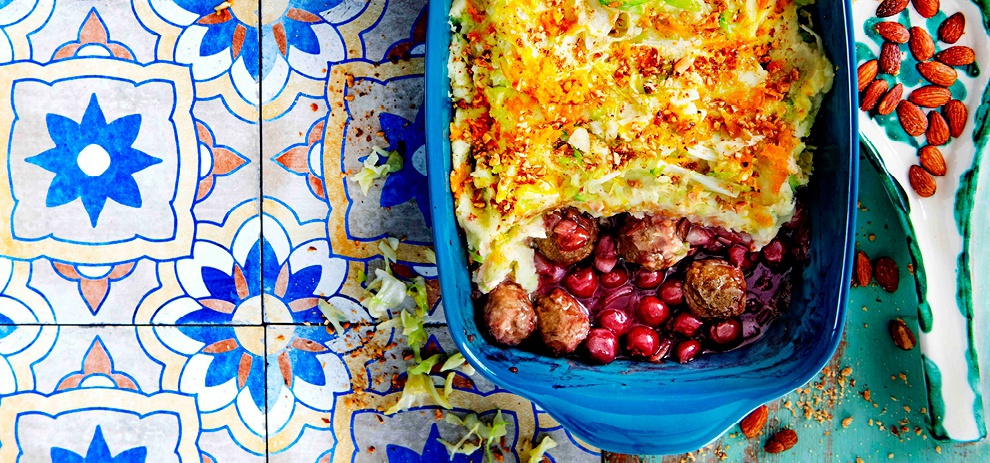 Almôndegas-ovenschotel met kersen, spitskoolpuree en amandel