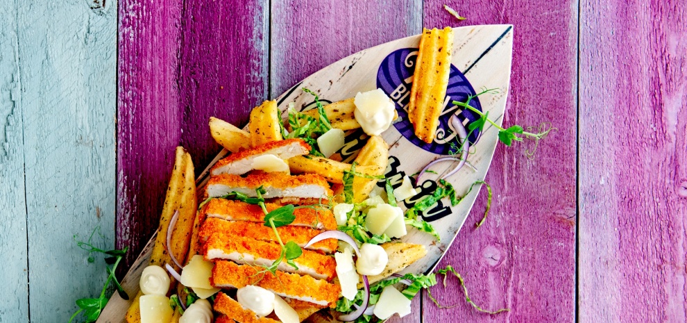 • Schep de Wavy friet op 4 leuke planken of borden. Snijd de krokante kipfilets in reepjes. Verdeel de sla, de kip en de ui over de friet.
