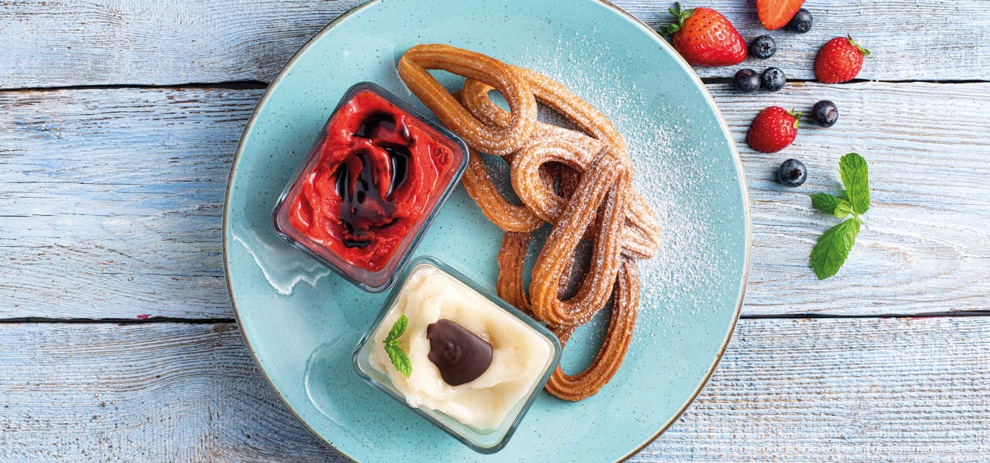Churros met aardbeiendip en perendip