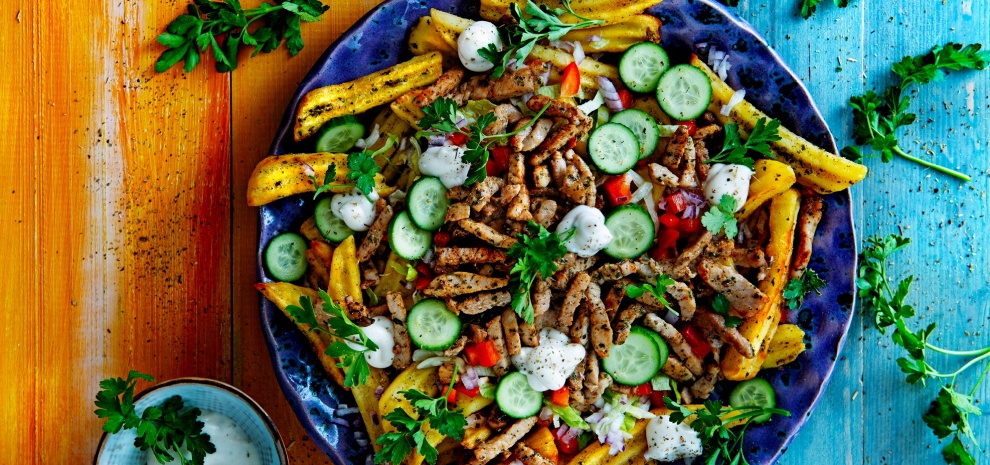 - Schep de Wavy friet op 4 borden of planken. Verdeel er de ijsbergsla, de paprika, de komkommer en de ui over. Schep de gyros erop.