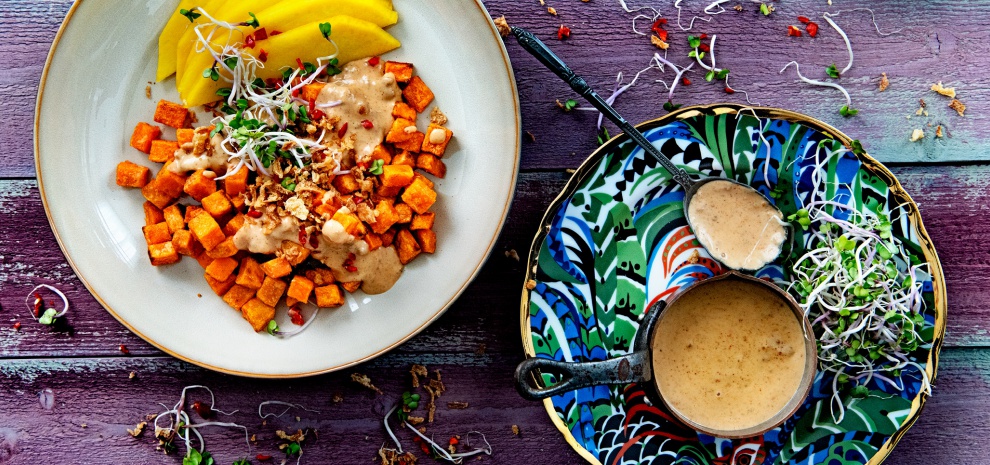 - Leg de mango erbij en serveer de rest van de pindasaus apart.