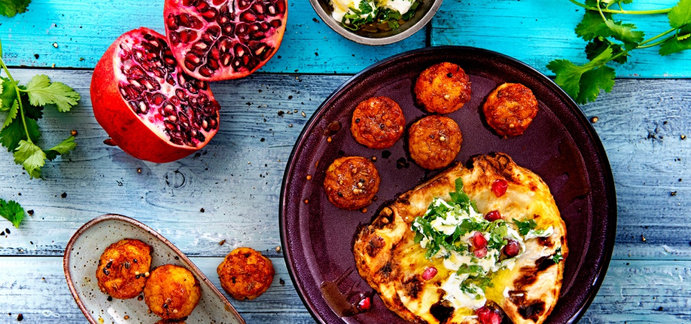 - Hak intussen de koriander fijn en pers de knoflook. Roer in een schaaltje de yoghurt los met de koriander en de knoflook. Bestrooi met de granaatappelpitjes.