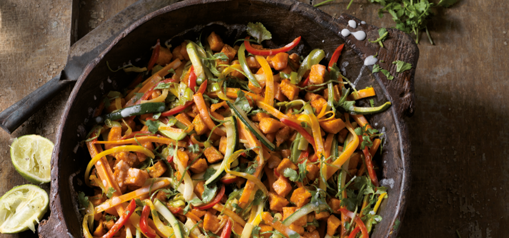 Kokos en koriander schotel met zoete aardappelblokjes