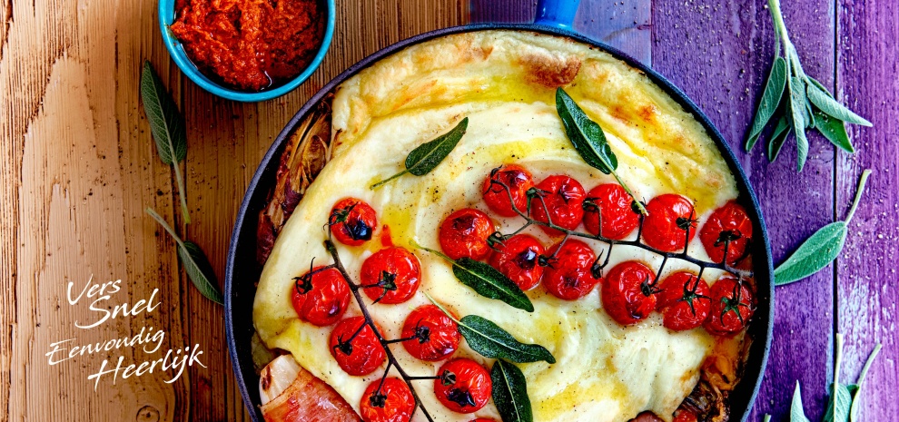 - Zet de pan 15 minuten in de oven, tot de puree begint te kleuren en de tomaatjes sappig zijn en openbarsten.